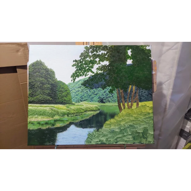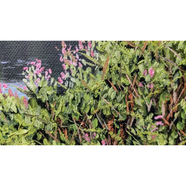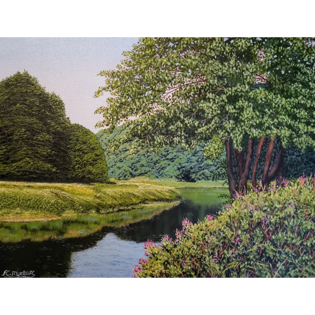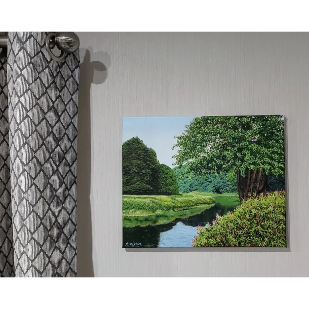 The gentle rustle of leaves in this serene landscape presents an engaging scene from the outset. Meticulous detail emerges in the reflection of lush foliage on tranquil water, demonstrating the precision often found in classical landscape art. This piece subtly challenges expectations with its arrangement of light and shadow, offering both clarity and mystery. The combination of rich greens and soft pinks creates an experience that transports one to a quiet moment in nature. As you explore the textures and layers, the scene unfolds in a hushed, thoughtful atmosphere, encouraging a moment of calm introspection.