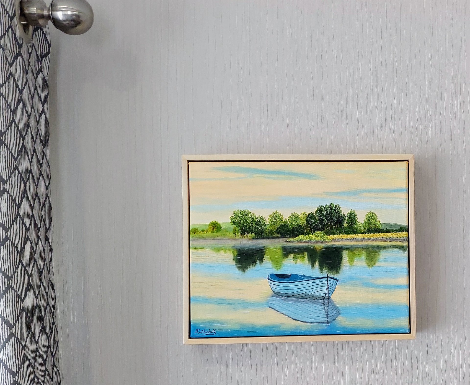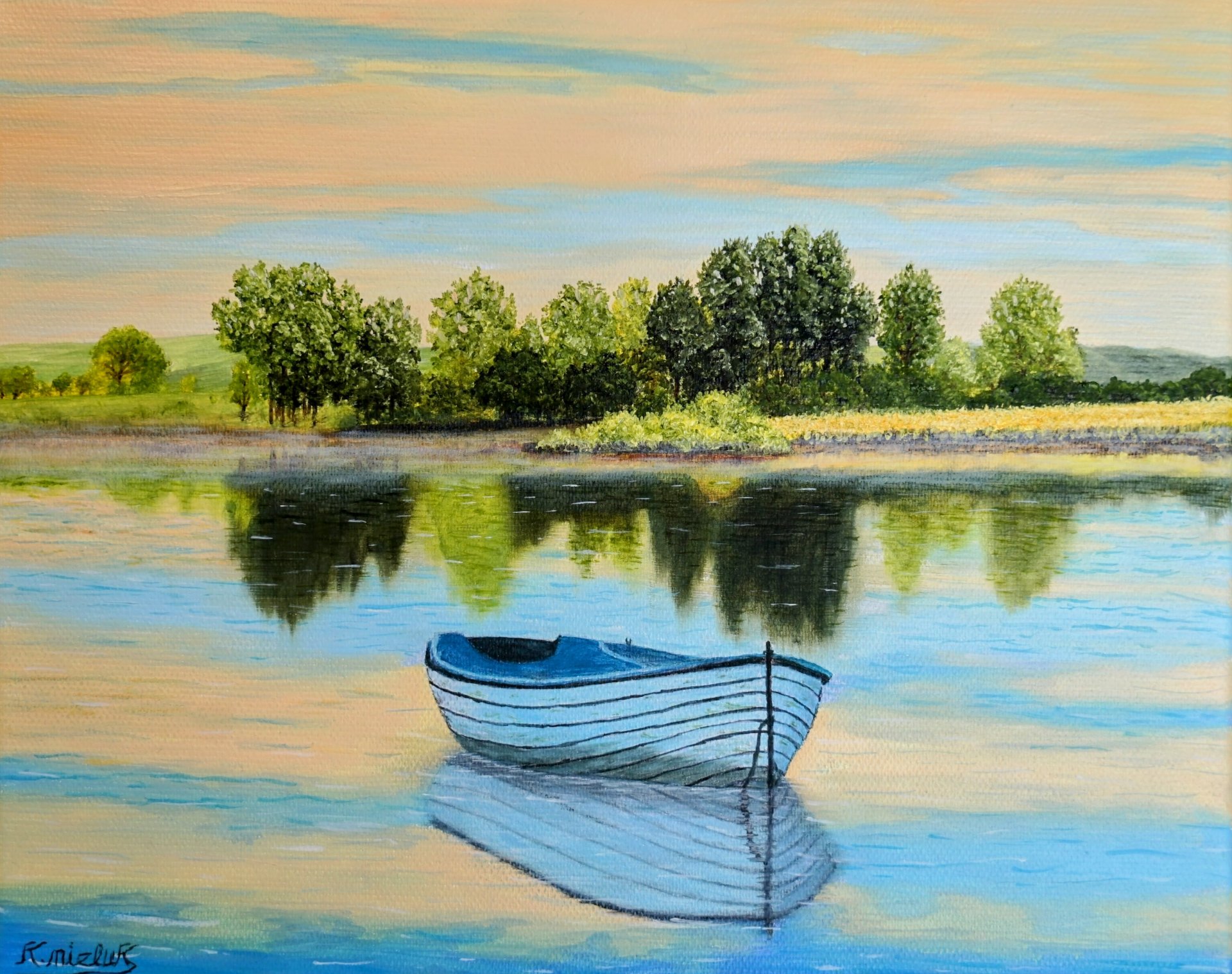 A small boat floats peacefully on a serene lake, with its reflection visible in the calm water. The background is adorned with lush green trees and a soft pastel sky, creating a tranquil and idyllic scene.